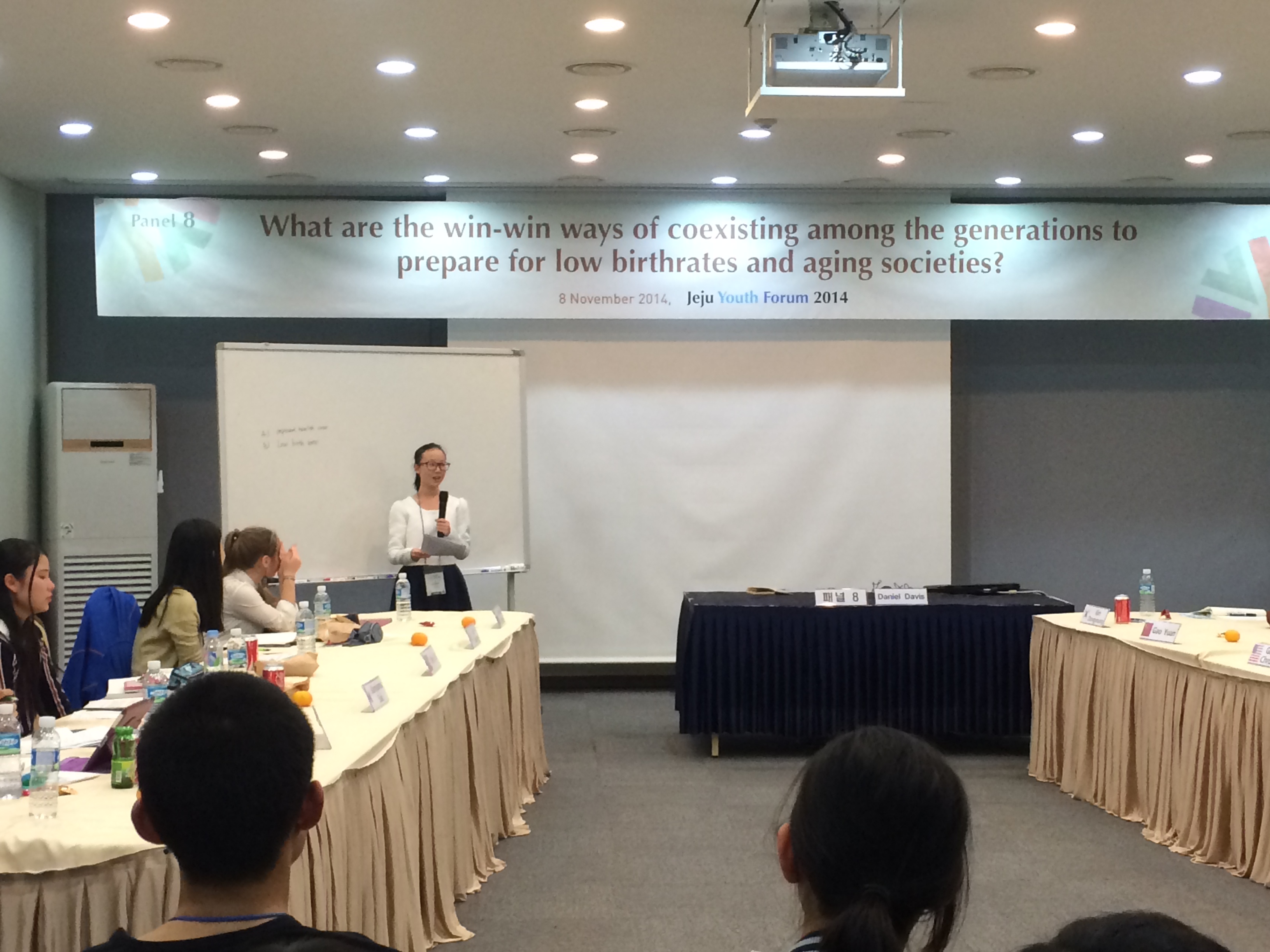 韩国济州青年论坛组织方进行了非常有效的组织和安排。1. 安排每组三个老师(一位美国外教,两位韩国老师),12-14名成员学生,十几名韩国的学生观众,和两名学生志愿者。2. 每个会场门口都有统一的指示牌写明议题及成员、成员的国家等,会场内布置都不同,但都有白板、电脑和投影仪,每位学生面前都有姓名牌,气氛庄重,观众席也配有名字。3. 论坛历时四个小时,开始时利用游戏活跃气氛,然后学生抽签进行三分钟的演讲,接受其他学生或观众针对性地提问,如果没人提问,外教有事先准备问题,叫观众读出来(主办方准备得非常充分)。